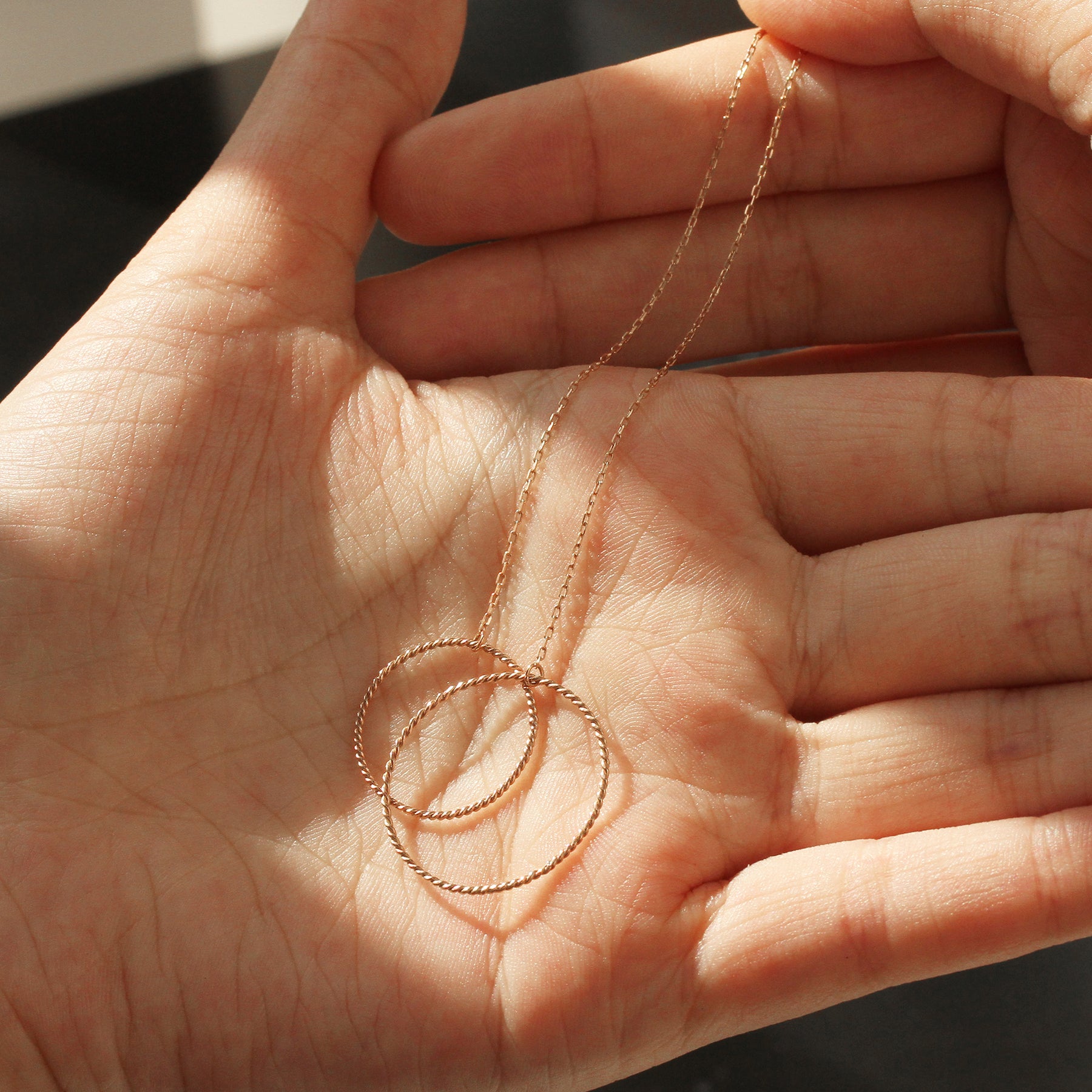 Long chain 14K rose gold threaders with twin circle design