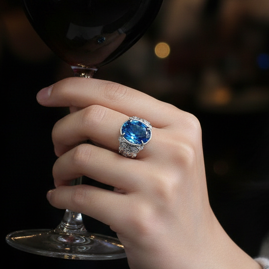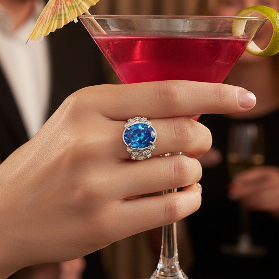 Large blue oval cocktail ring featuring halo side stones and polished silver band