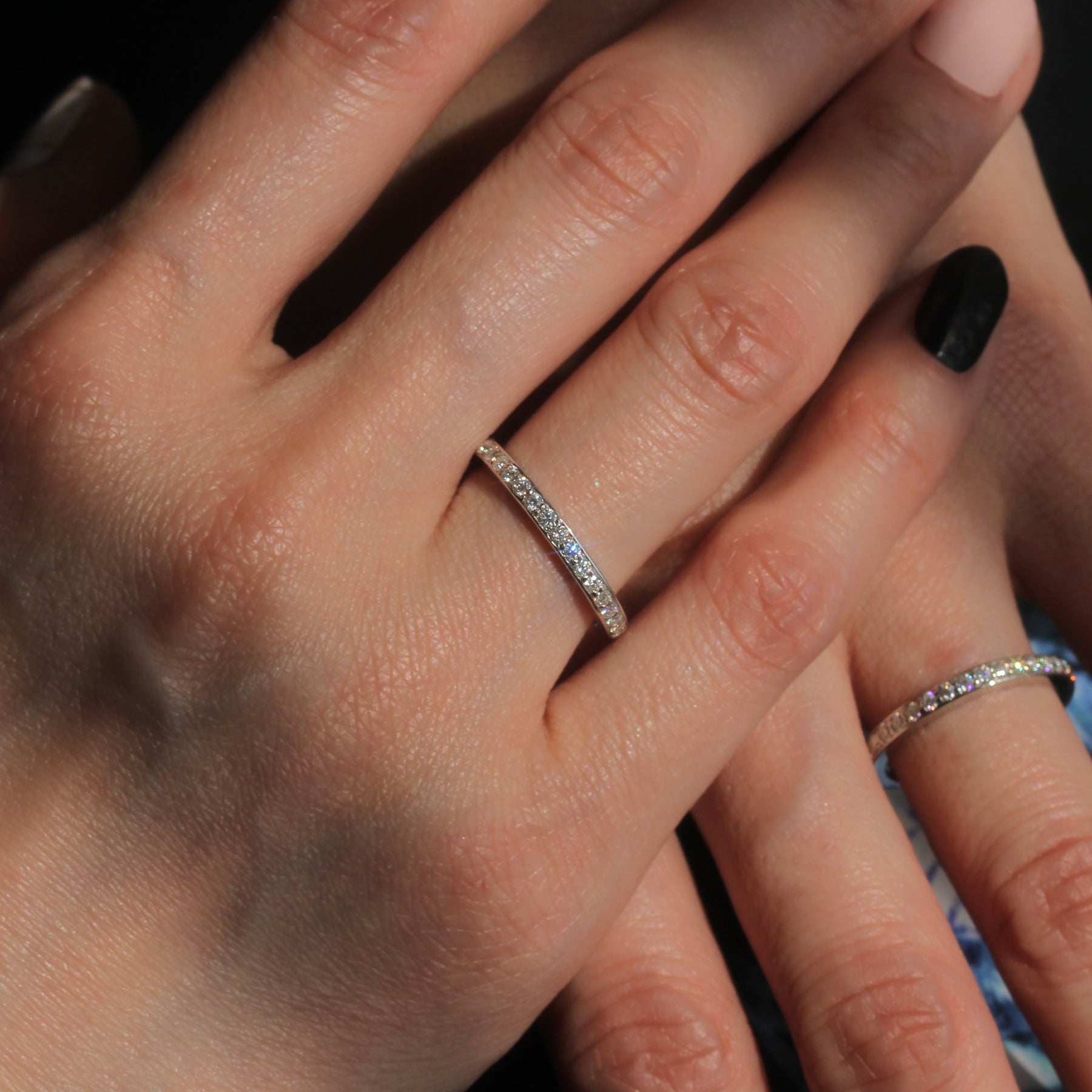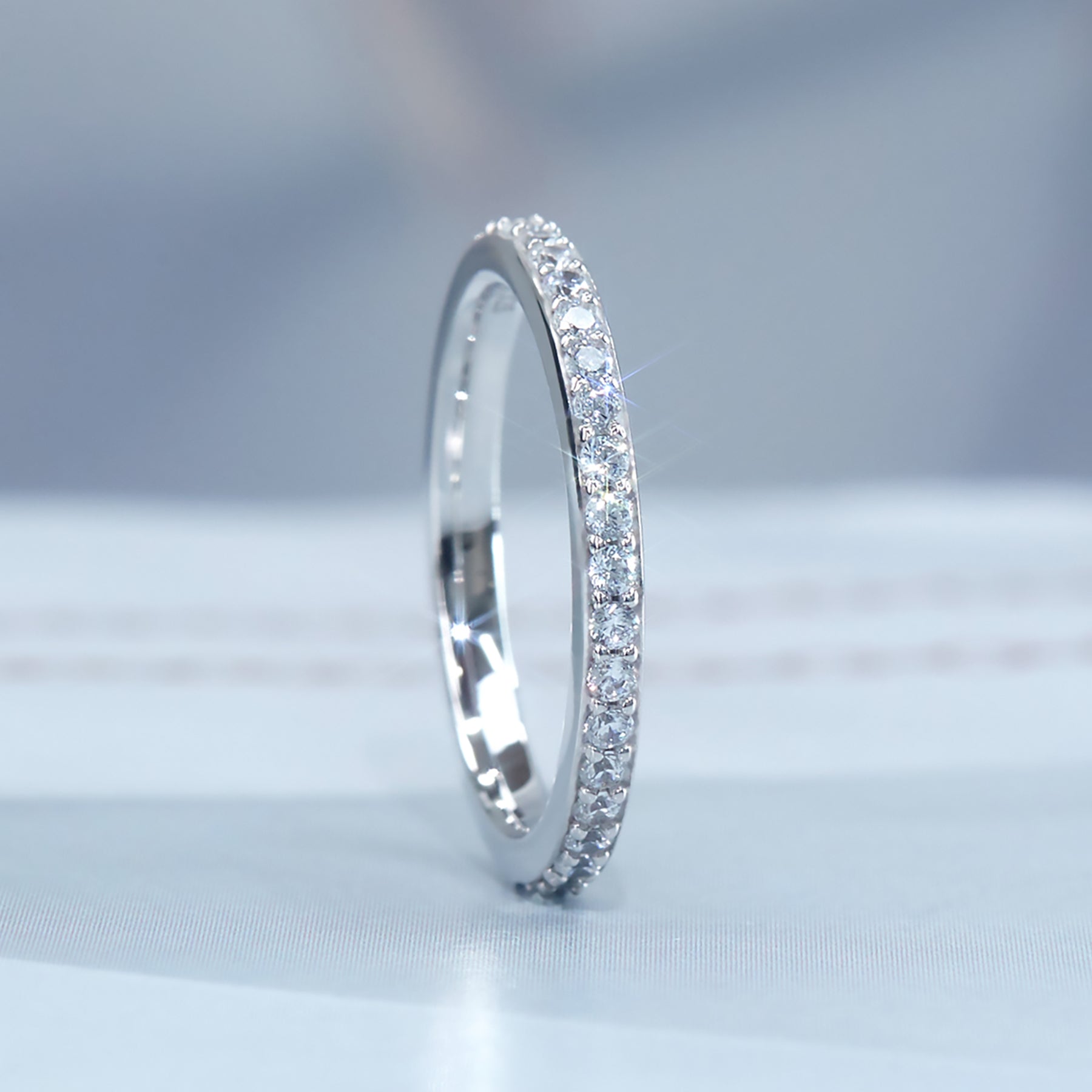 The Soft Shine Eternity Ring: A refined 2mm band featuring fully encircled, brilliant moissanite stones that represent a love without end.